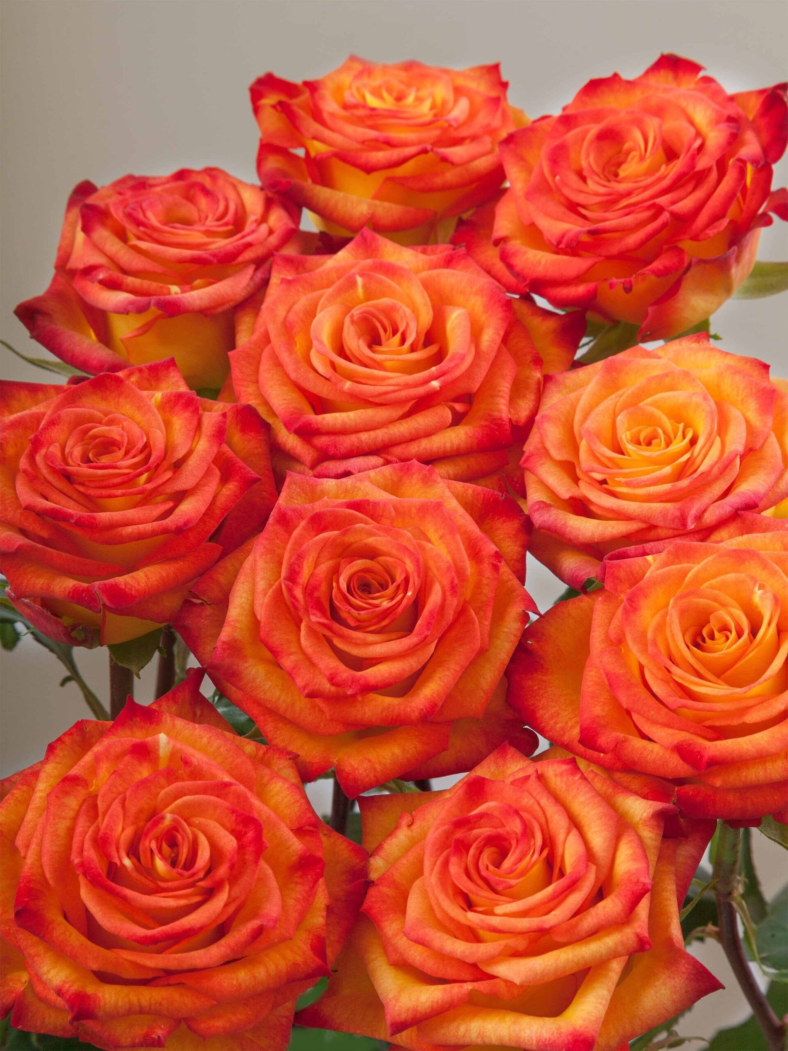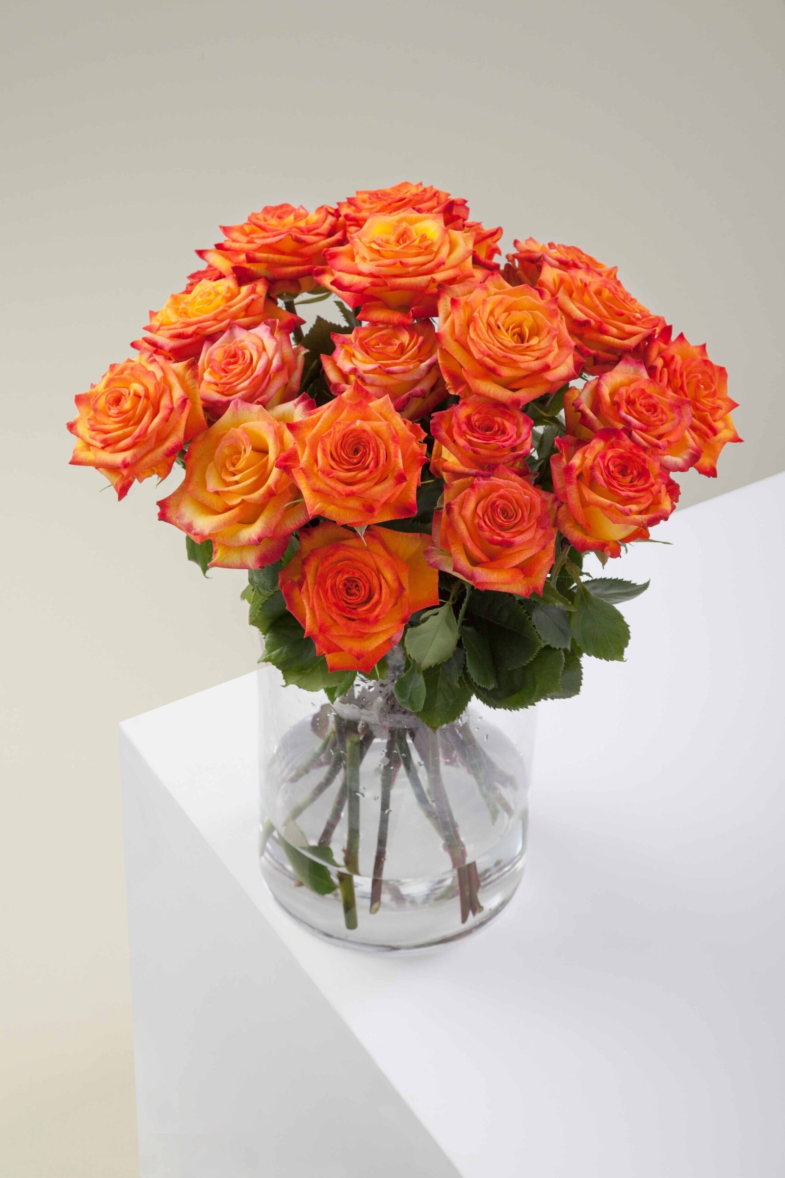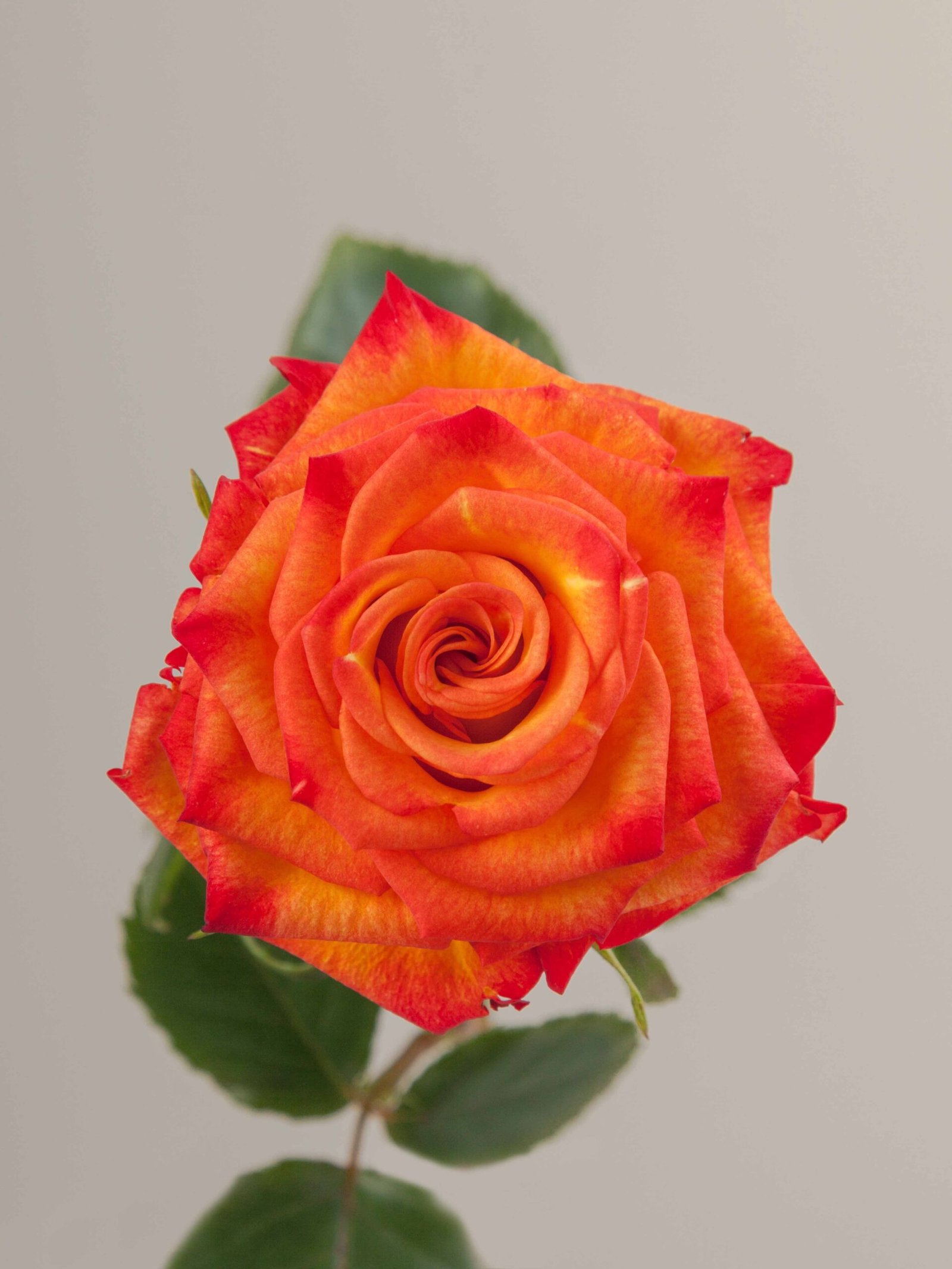 Dėmesį prikaustanti dvispalvė geltona rožė su oranžiniu atspalviu žiedlapių kraštuose. Linksma ir kasdieniška.