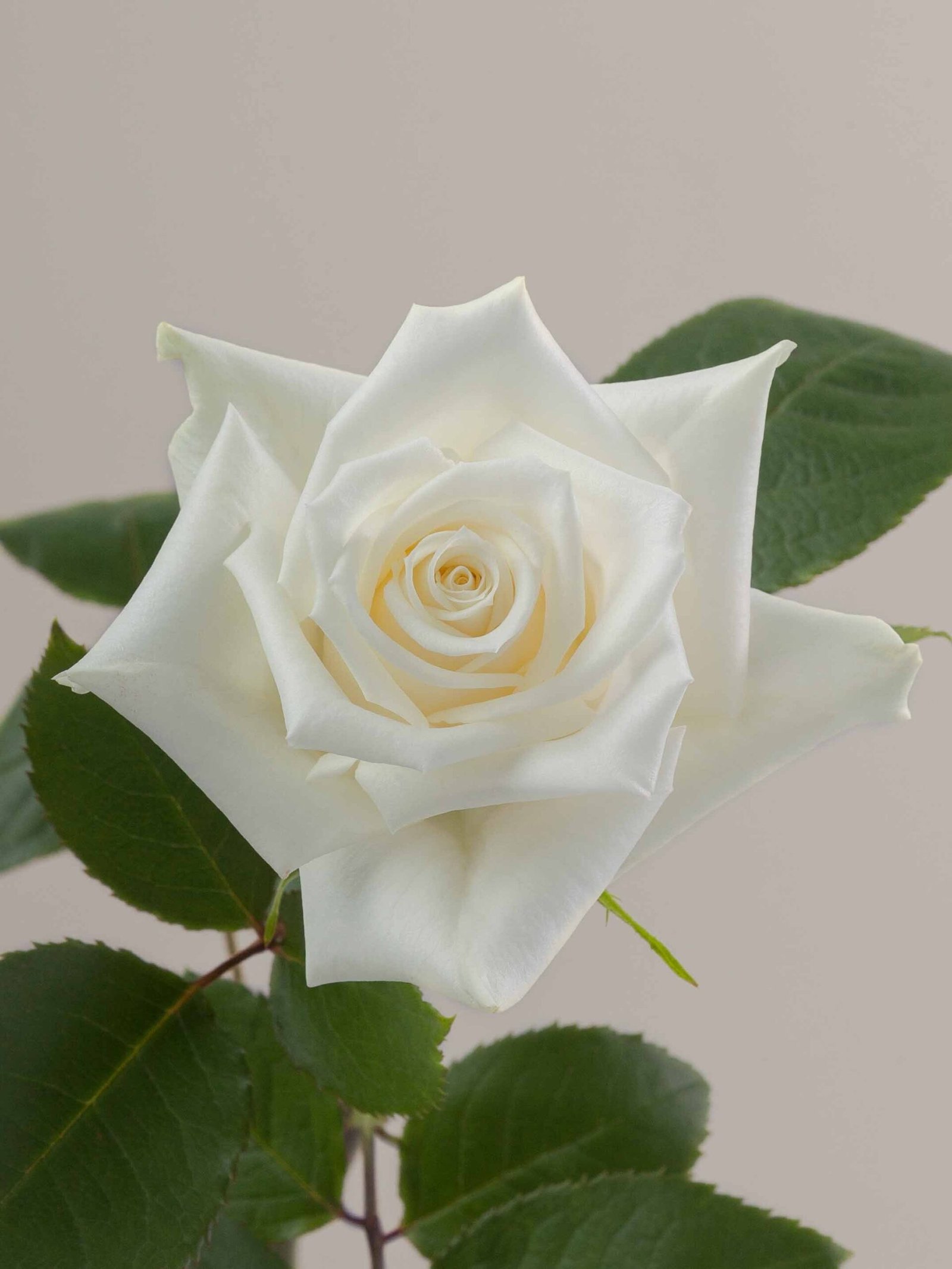 „Escimo“ derina ryškiai baltus žiedlapius, stilizuotą formą kvadratiniais kraštais ir lengvą geltoną akcentą centre.