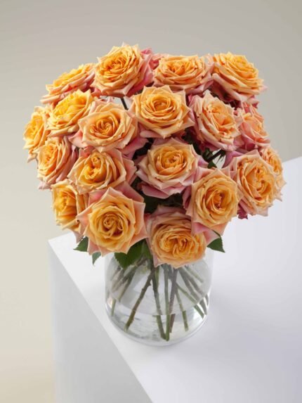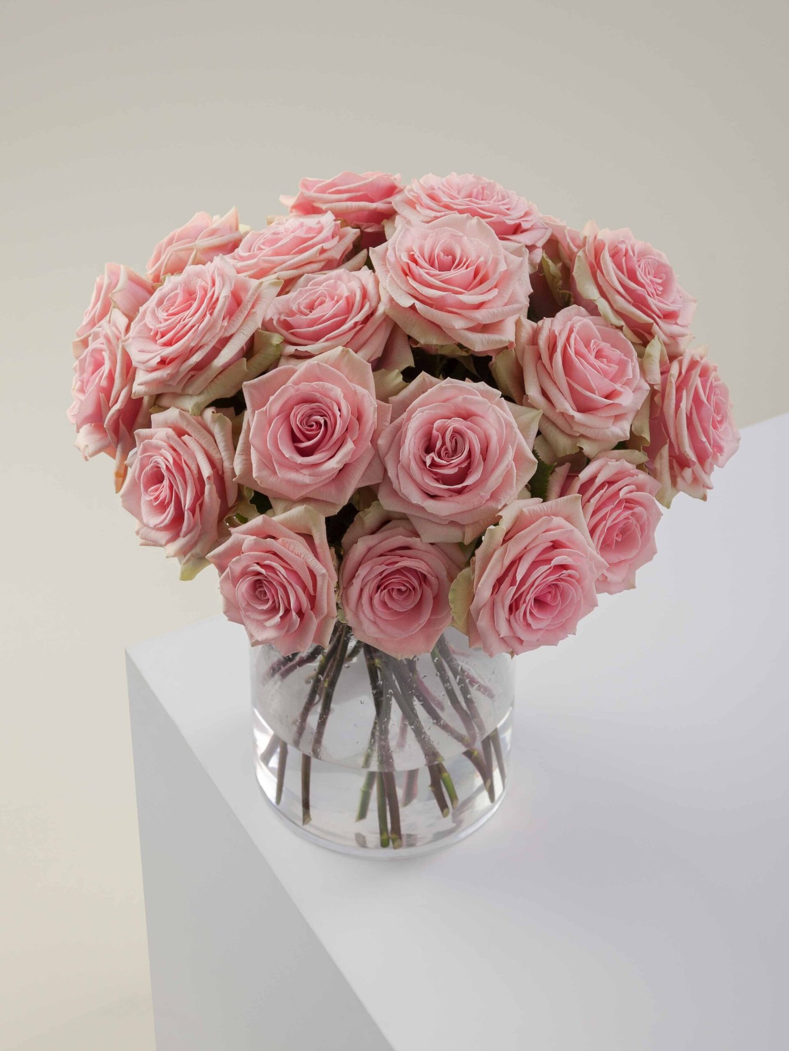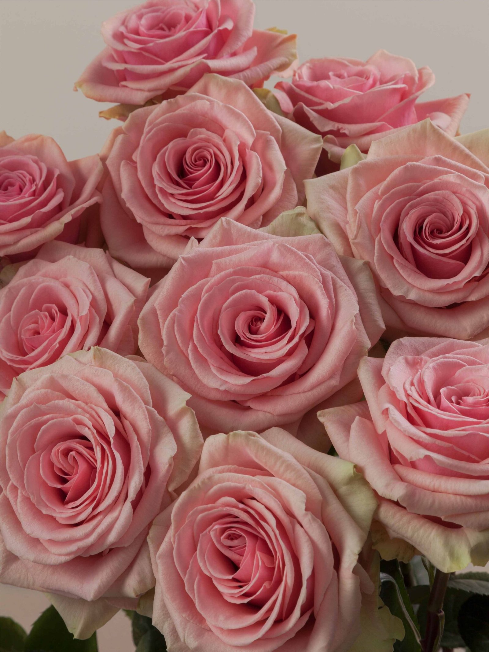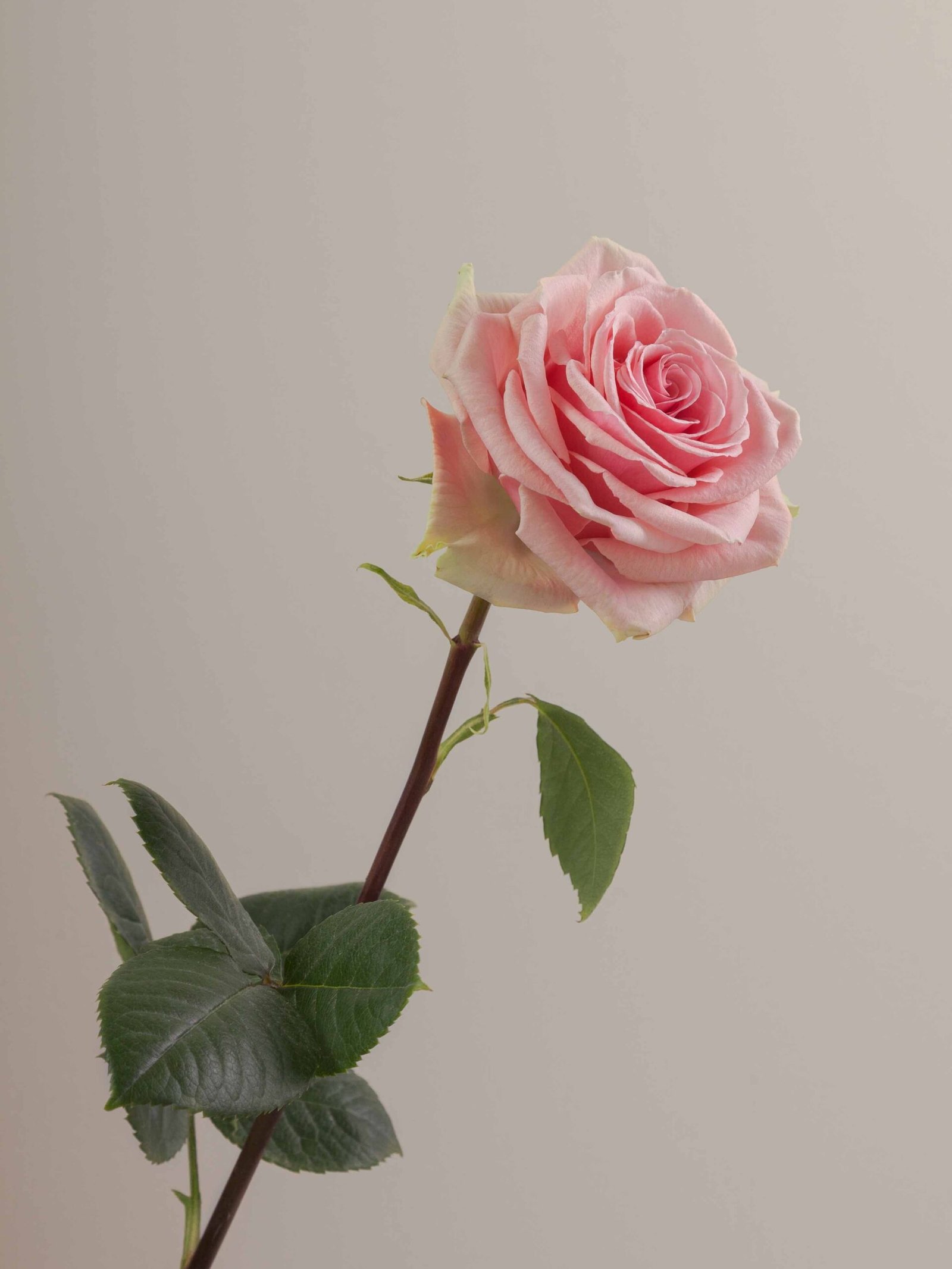 Švelni, pudros rožinė rožė su žaliais išoriniais lapeliais ir lengvai banguotais žiedlapiais.