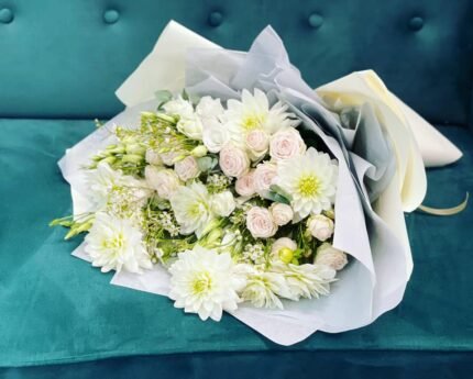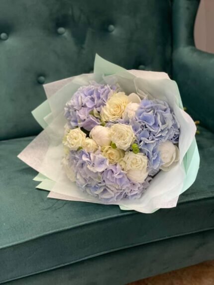 Į puokštę įeina Leila krūmo rožė, kreminė krūmo rožė, eustoma, genista.